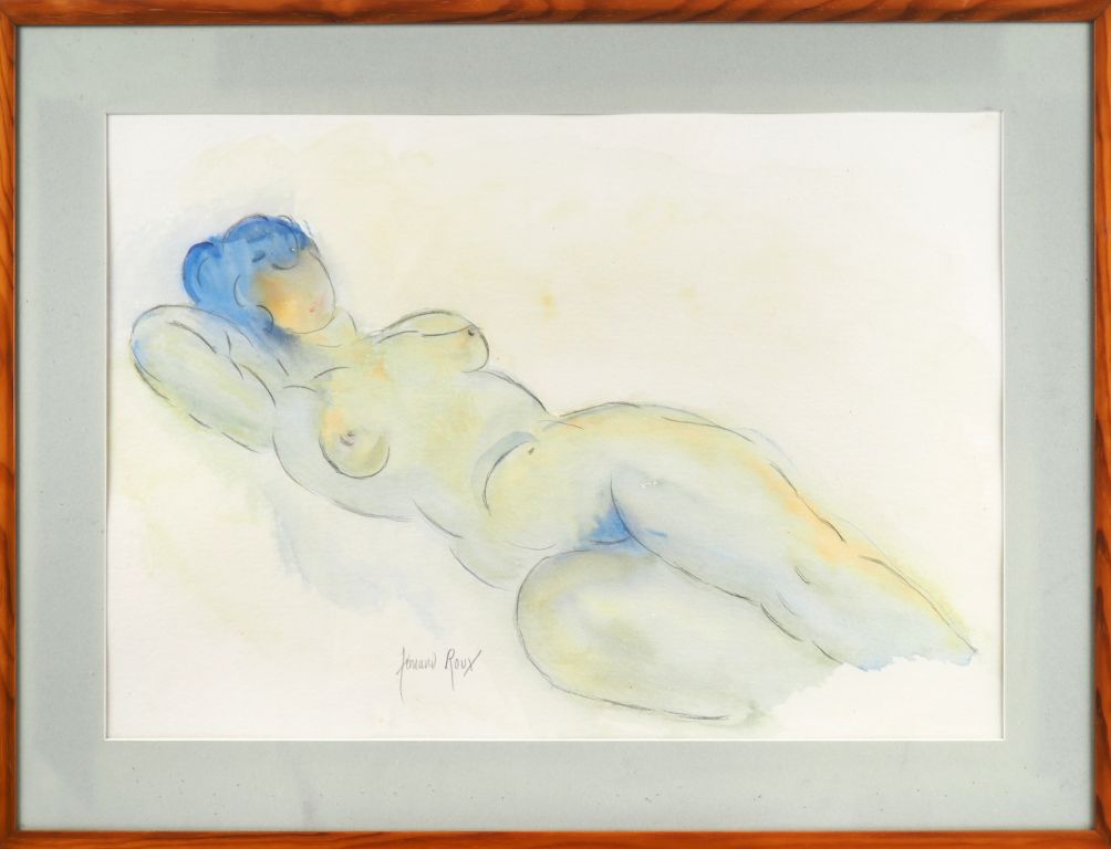 Fernand ROUX. "Nu bleu". Aquarelle, signée en bas à gauche. Dim. (à vue) : 46 x 66 cm.
