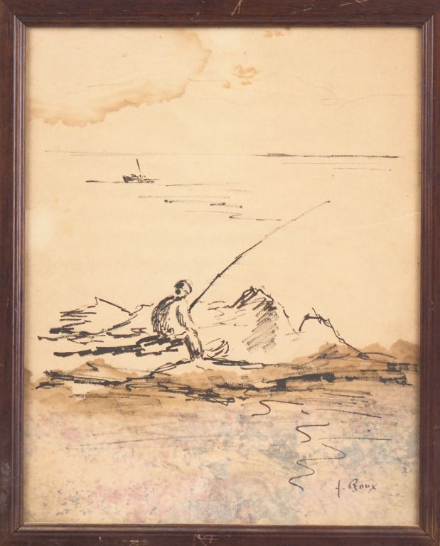 Fernand ROUX. "Pêcheur en bord de mer". Dessin, signé en bas à droite. Dim. (à vue): 29 x 23,5 cm.