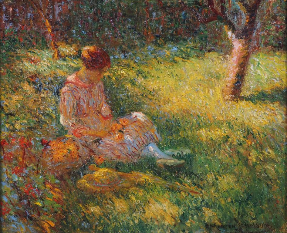 Francis MORTON JOHNSON. "jeune femme cueillant des fleurs" Huile sur toile, signée en bas à droite Dim. 50 x 60,5 cm