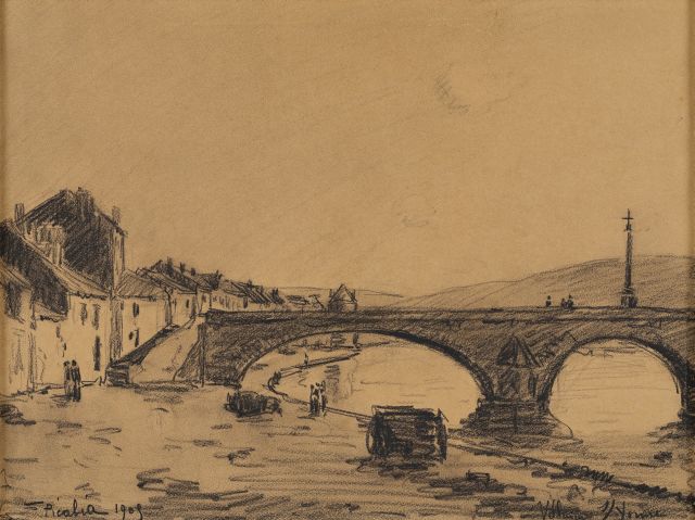 Francis PICABIA 'Pont à Villeneuve-sur-Yonne, 1909' Dessin au crayon noir sur papier beige (insolation et très petite déchirure sur le bord en haut à vers la droite) signé et daté en bas à gauche, situé en bas à droite 25,5x34 cm Un certificat du comité Picabia sera remis à l’acquéreur. Expert : Cabinet Maket