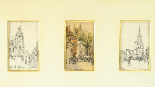 Frank BOGGS. Trois différentes études de villes animées. Trois dessins au crayon noir et à l'aquarelle dans un même encadrement. 18,5 x 10,5 cm
