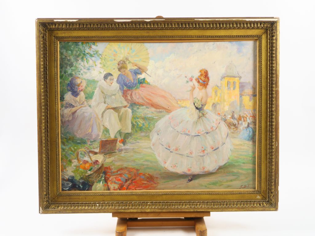 G. BEFANI "Pierrot et ses drôles de dames" Huile sur toile. Signée en bas à droite. 50 x 65 cm