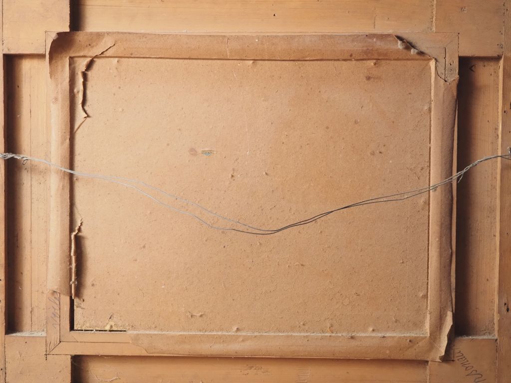 G. CLARIS. "Les soldats à la gamelle" Gouache, signée en bas à droite, dans son cadre d'époque en bois et stuc doré ajouré (petits éclats) Dim. À vue : 34 x 45 cm