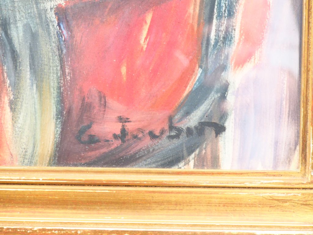 G. JOUBIN. "Femme assise, combinaison, jupe rouge" Huile sur papier, signée en bas à droite. Dim. 64 x 49 cm