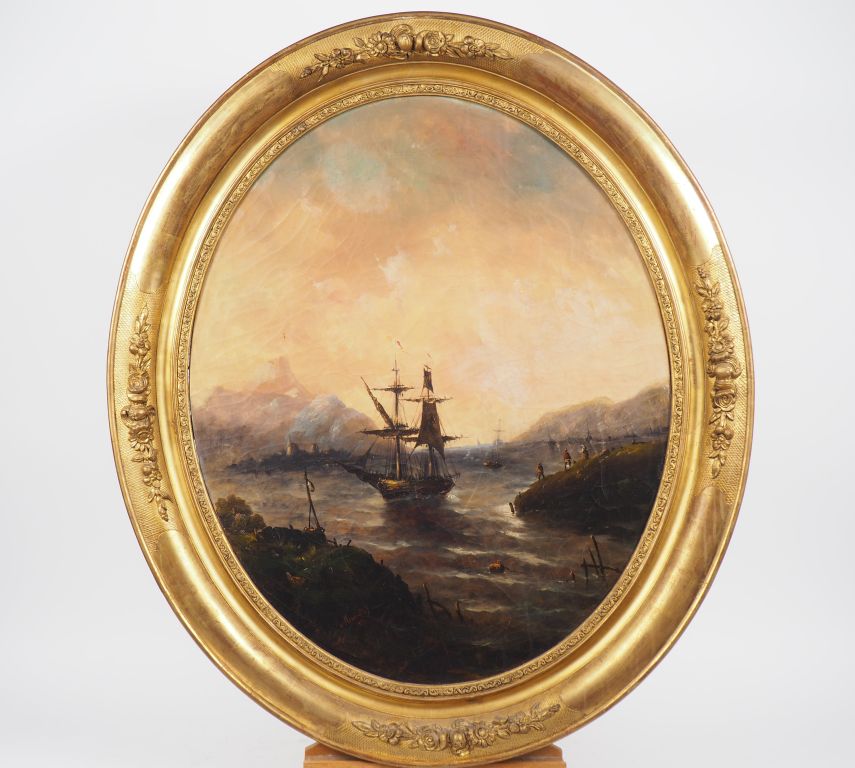 G. MERVILLE. "Marine" Huile sur toile, signée en bas à gauche et datée 1865 cadre ovale en bois doré Dim. 72 x 58 cm