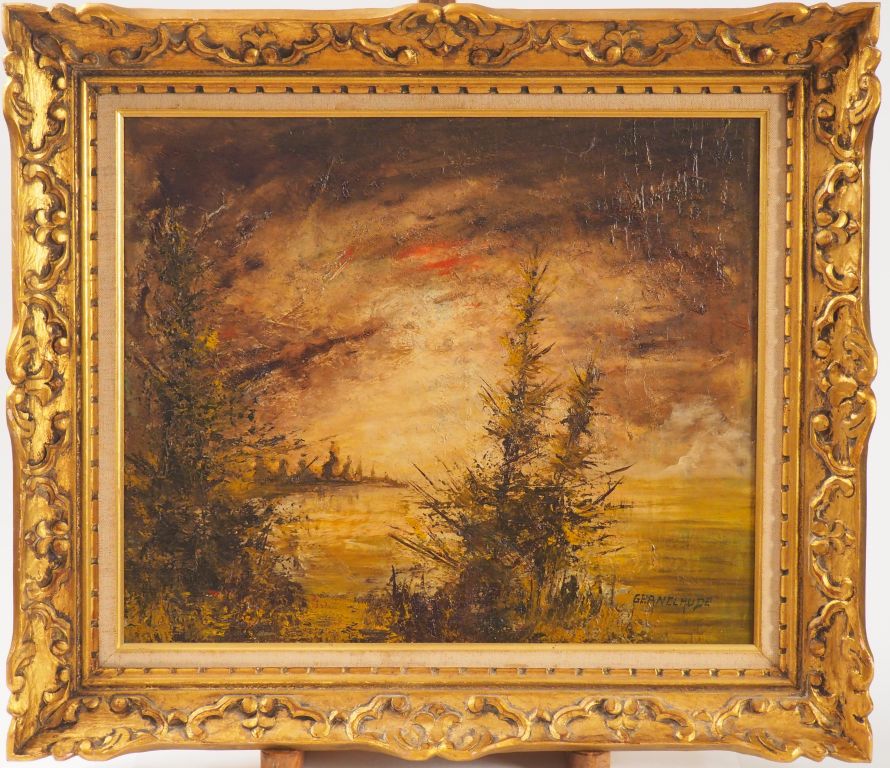 GEANCLAUDE "Paysage lacustre" Huile sur toile, signée en bas à droite Dim. 46 x 55 cm