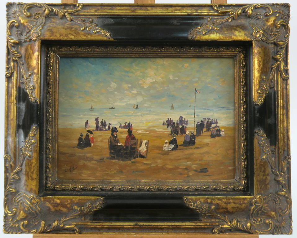 Georges VILLIE. "Bains de mer à la Belle Epoque". Paire d'huiles sur panneaux, signées. Dim. 19 x 26,5 cm.