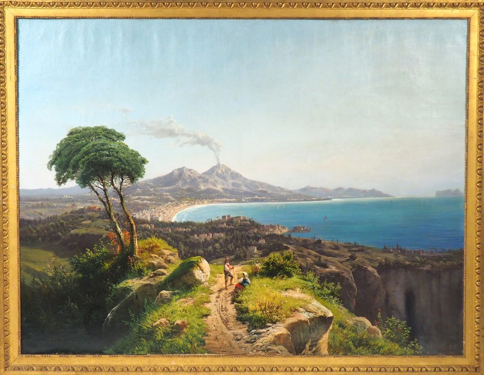 GODCHAUX. "La baie de Naples" Grande huile sur toile, signée en bas à gauche , dans son cadre à godrons en bois et stuc doré. Dim. 149 x 199 cm (restaurations)