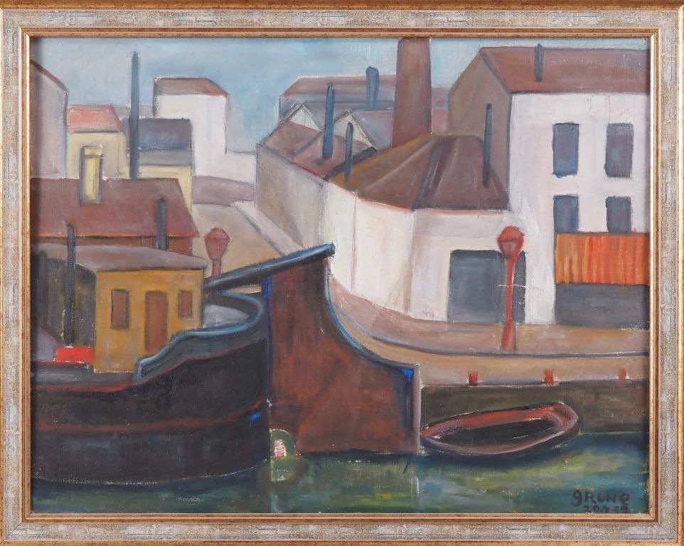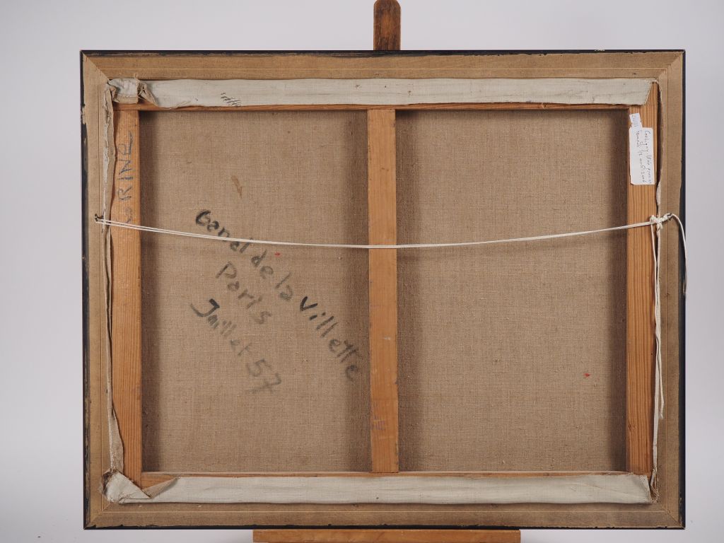 GRINE. "Paris, le canal de la Villette" Huile sur toile, signée en bas à droite Dim. 50,5 x 65,5 cm