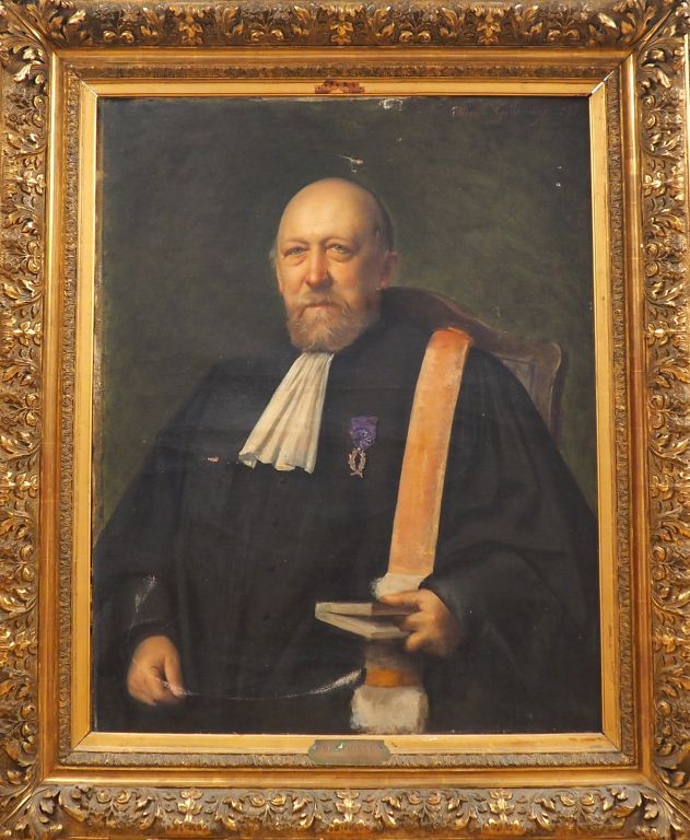 GUILLAUMEY. "Portrait d'homme aux palmes académiques". Huile sur toile, signée en haut à droite et datée 1899. Dim. 93 x 73 cm. (Restauration, petits accidents).
