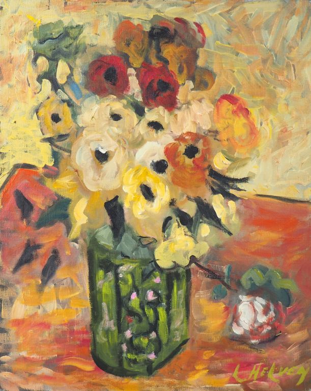 HELVEN. "Bouquet de fleurs sur une table". Huile sur toile, signée en bas à droite. Dim. 50 x 40 cm.
