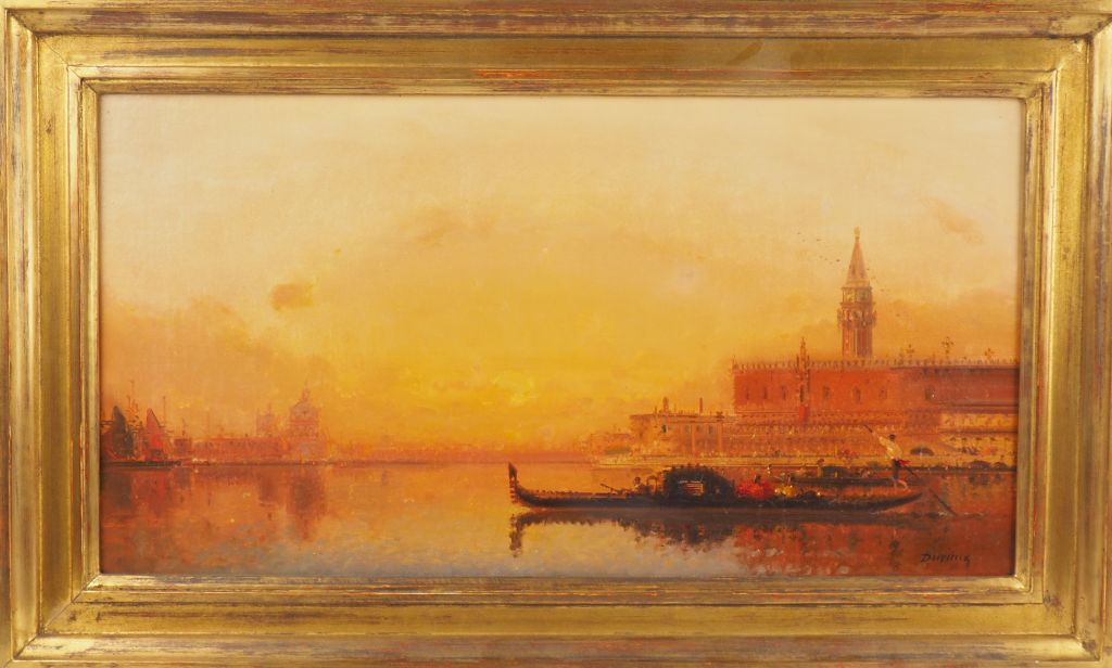 Henri DUVIEUX. "Venise, le grand canal au soleil couchant" Huile sur toile, signée en bas à droite Dim. 34,5 x 65 cm (restaurations)