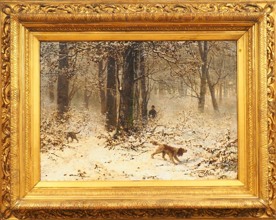 Henri VAN SEBEN. "Partie de chasse sous la neige". Huile sur toile, signée et datée en bas à droite. Dim. 54 x 75 cm. (Petite restauration).