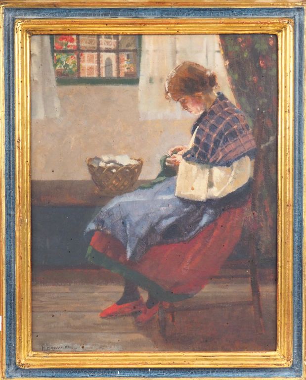 Herman N. HYNEMAN. "Jeune femme à l'ouvrage". Huile sur toile? signée en bas à gauche. Dim. 46,2 x 36,5 cm.