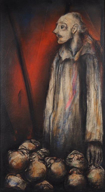 IANOSKY. "Personnage et têtes de mort" Huile sur toile, signée en bas à droite Dim. 74 x 62 cm