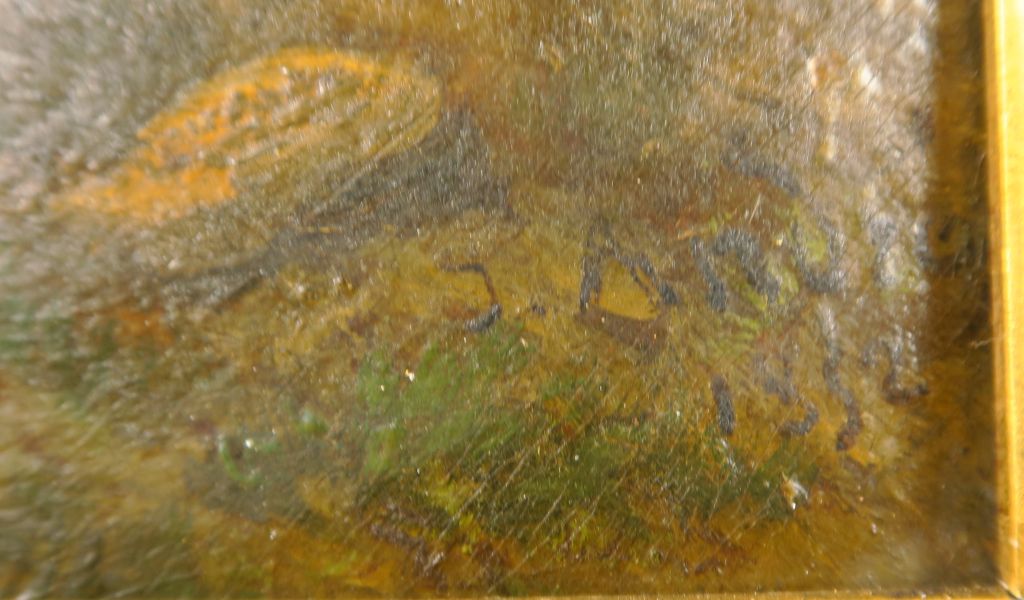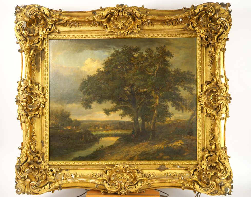 J. ANDRE « Paysage animé » Huile sur toile. Signée en bas à droite et datée 1852. Dans son cadre d’époque de style rocaille en bois et stuc doré, sculpté et ajouré. 54 x 65 cm (quelques accidents au cadre)