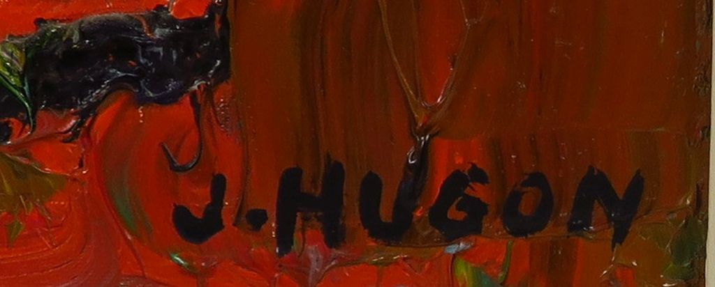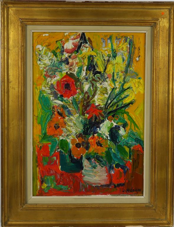 J. HUGON. "Bouquet de fleurs" Huile sur toile. Signée en bas à droite. Dim. 54 x 37 cm (accidents et sauts de peinture)