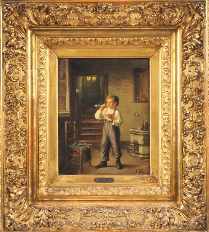 J.P HAAG. "Enfant à la bulle de savon". Huile sur panneau, signée en bas à droite, contresignée dans un cartouche. Joli cadre en bois et stuc doré de style Louis XIV. Dim. 27 x 21,5 cm.