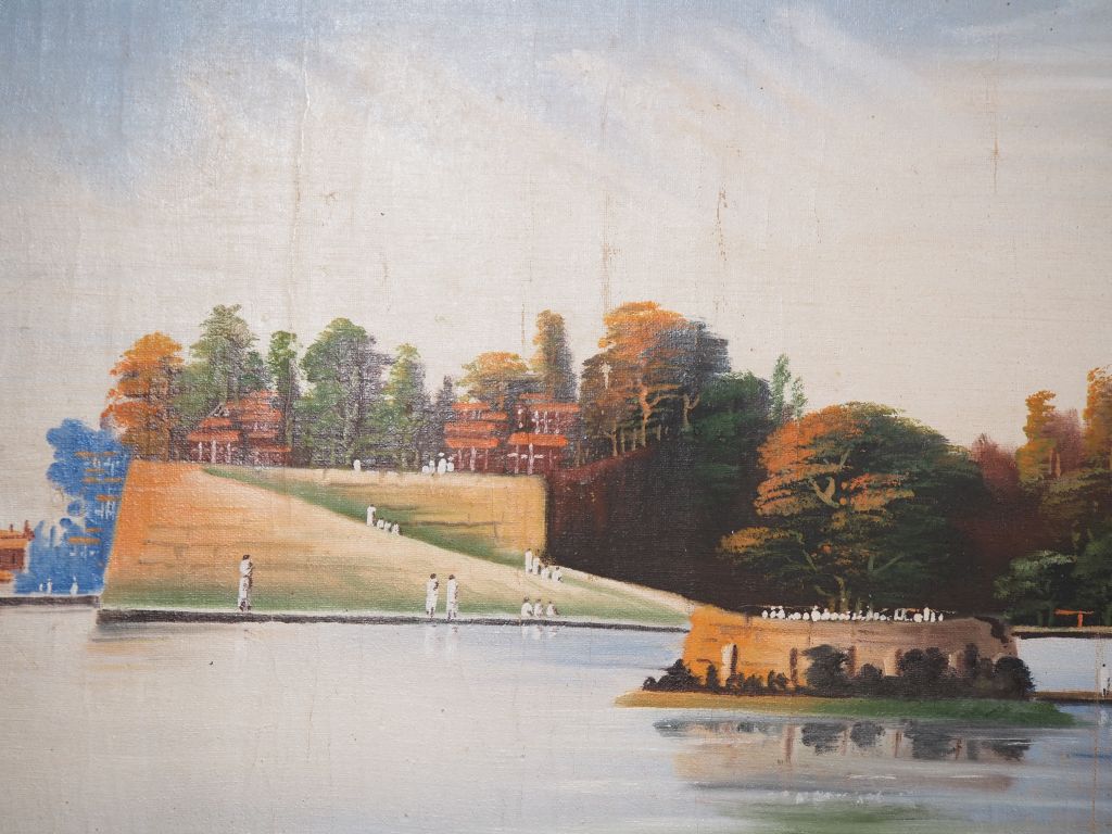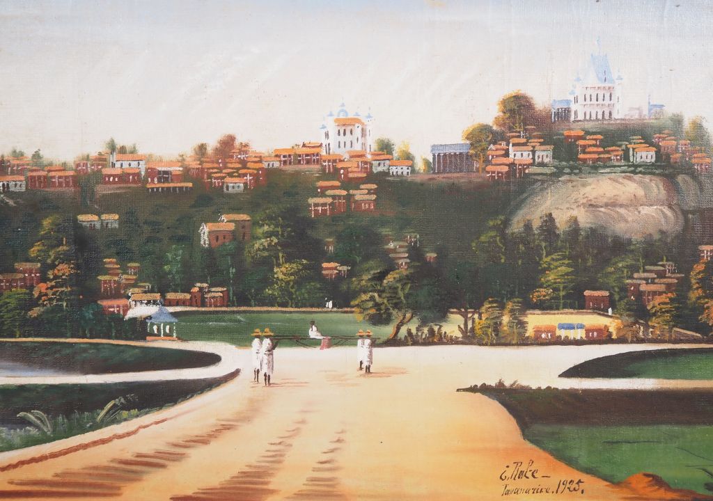 J. RAKE. "vue panoramique de Tananarive" Grande huile sur toile, signée à droite, située et datée 1925 Dim. 227 x 43 cm