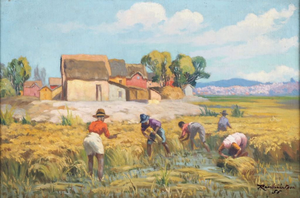 Jean RAMBININTSOA. "les moissons à Madagascar" Huile sur isorel, signée en bas à droite et datée 55 Dim. 40,5 x 60 cm