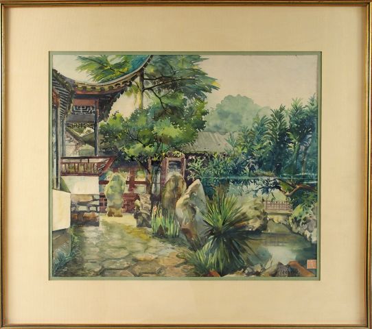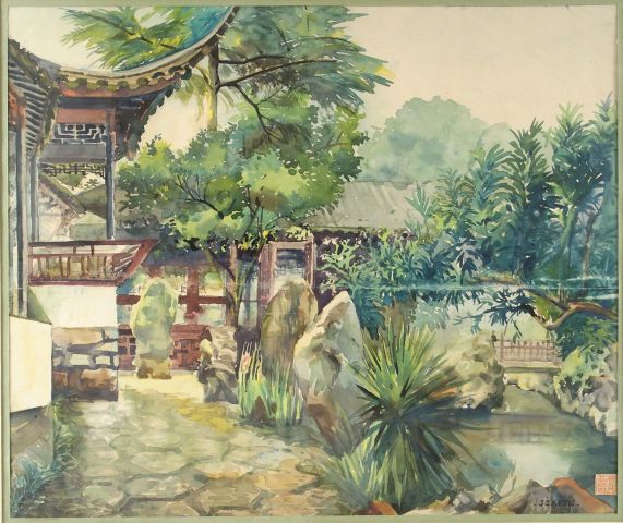 Lot de JIA PIM "Jardin indochinois". Aquarelle. Signée en bas à droite. 38,5 au prix de 200 à 300 € en vente aux enchères par l'hôtel des ventes Primardeco