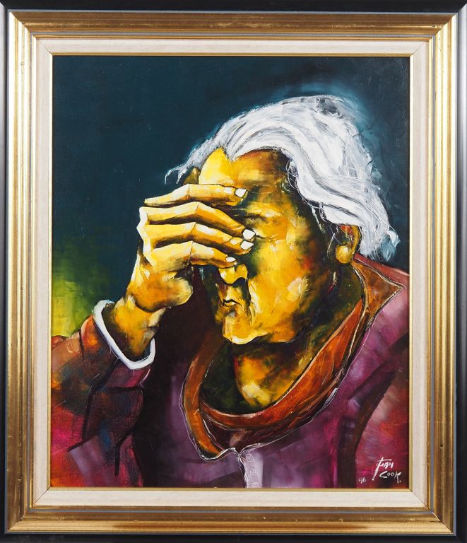 Juan COOK. "Fatigue" Huile sur toile, signée en bas à droite et datée 96. Dim. 55 x 46 cm