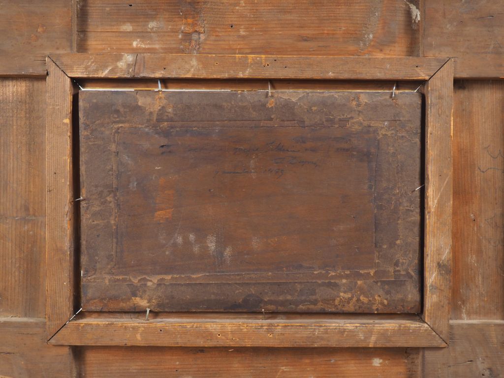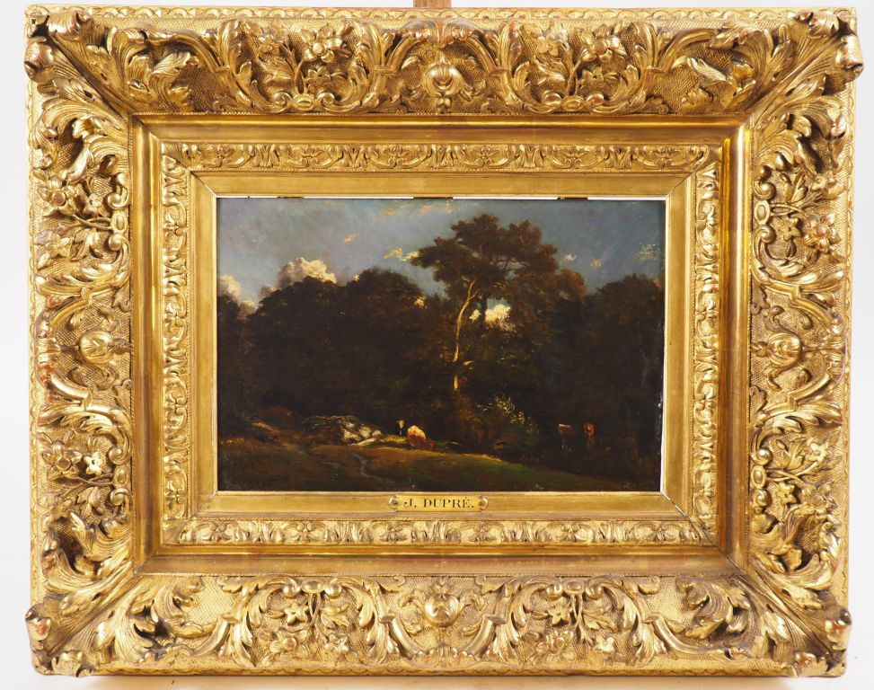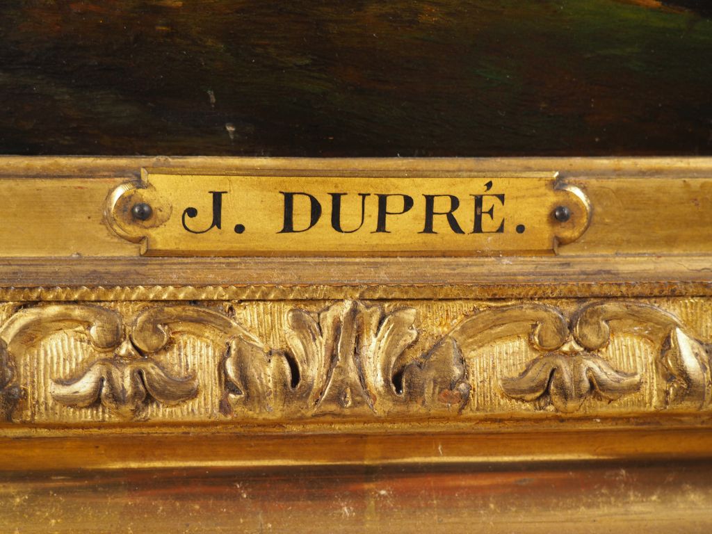 Jules DUPRE. "Paysage" Huile sur panneau d'acajou, signée en bas à gauche je certifie que le tableau est de moi Jules Dupré 7 novembre inventaire 1885 Dim. 24 x 36 cm Dans son cadre d'origine en bois et stuc doré à décor de feuillage Dm. Cadre : 54 x 65,5 cm