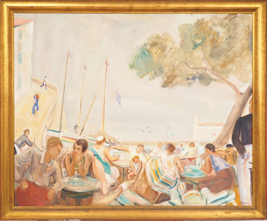L. ABELOUS « Bistrot sur la plage à Collioure » Huile sur toile. Signée en bas à droite. 80 x 98 cm