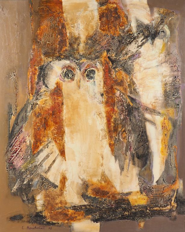 L. ROUBINET. "Les Hiboux". Huile sur toile, signée en bas à droite et datée 75. Dim. 100 x 81 cm