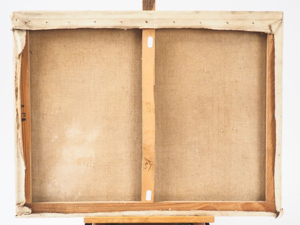 Léon GALAND. "nue à l'éventail". Huile sur toile, signée en bas à droite et datée 44. Dim. 50 x 65 cm. (petits manques)