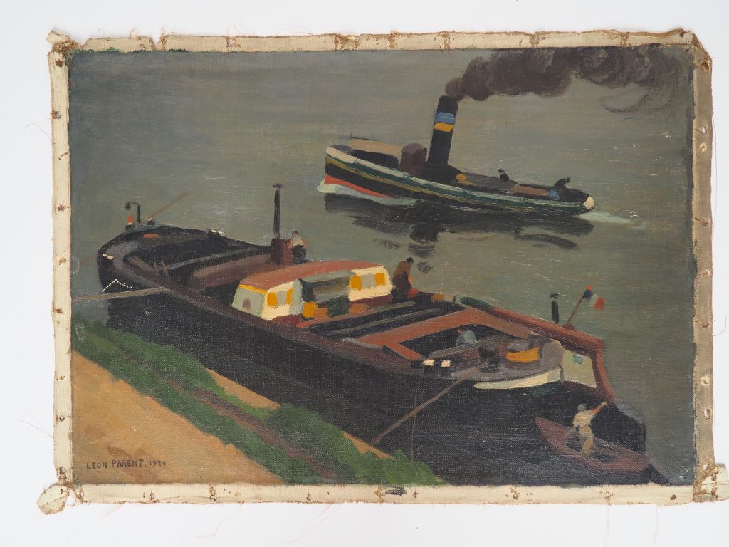 Léon PARENT. "péniches" Huile sur toile, signée en bas à gauche et datée 1920 Dim. 38 x 54,5 cm