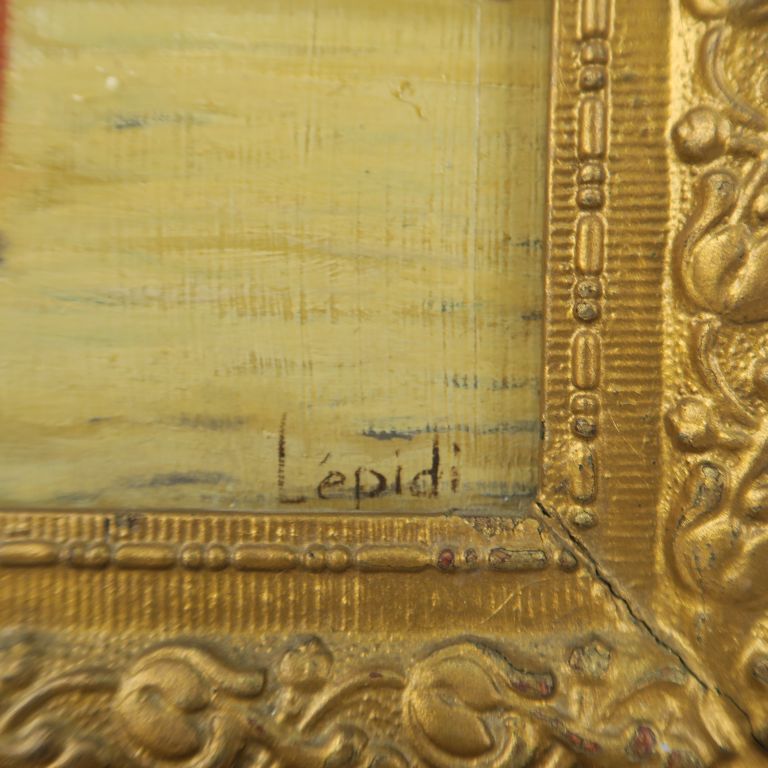 LEPIDI. "Elégants sur la plage". Huile sur panneau, signée en bas à droite. Dim. 29,5 x 20 cm.