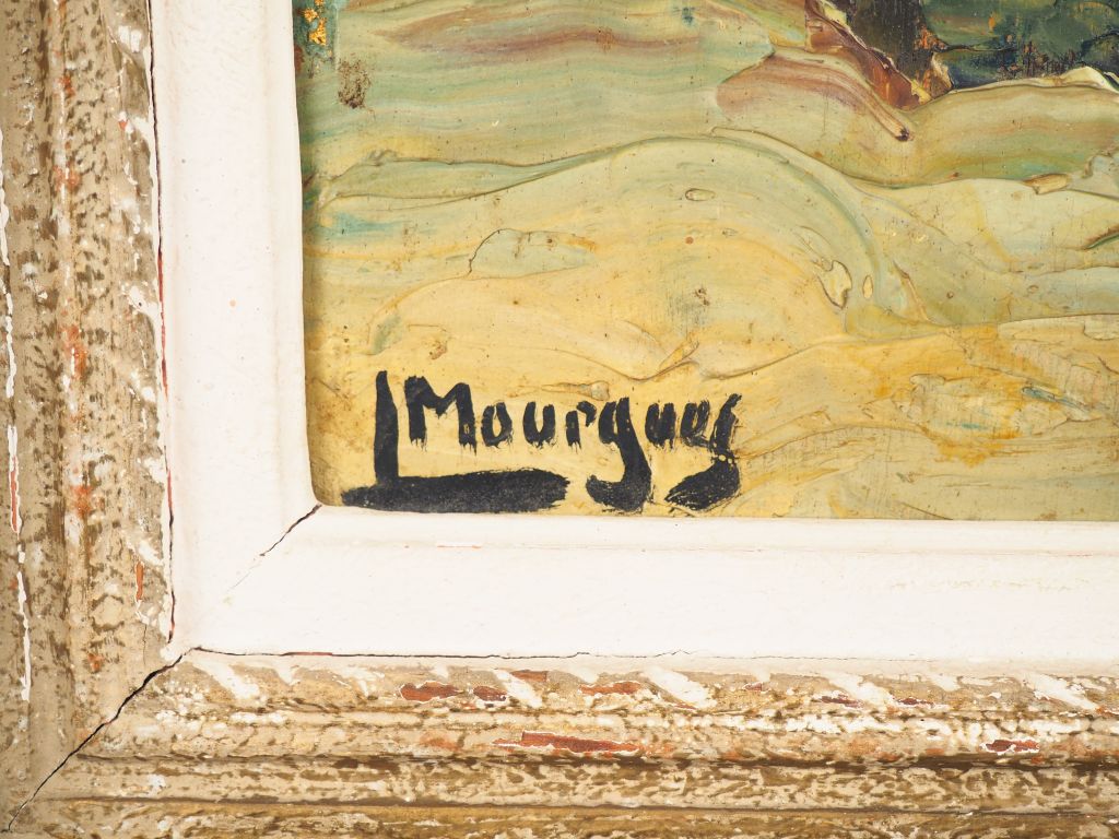 Louis MOURGUES. "Discussion dans la ruelle". Huile sur panneau signée en bas à gauche. Dim. 55 x 46 cm.