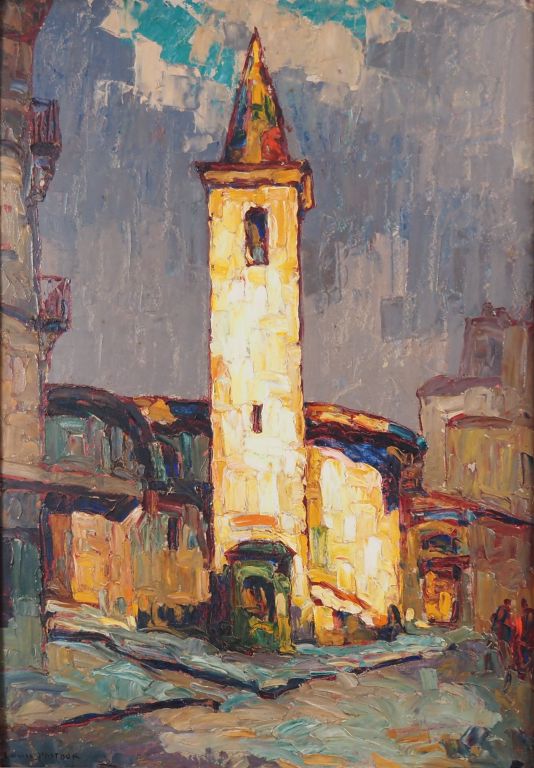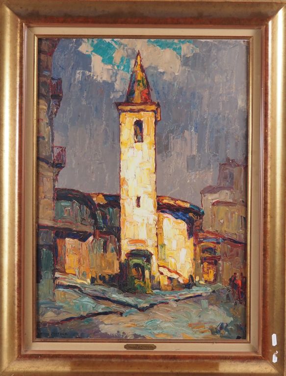 Louis PASTOUR. "Eglise, soleil d'orage" Huile sur carton, signée en bas à gauche Dim. 65 x 44 cm