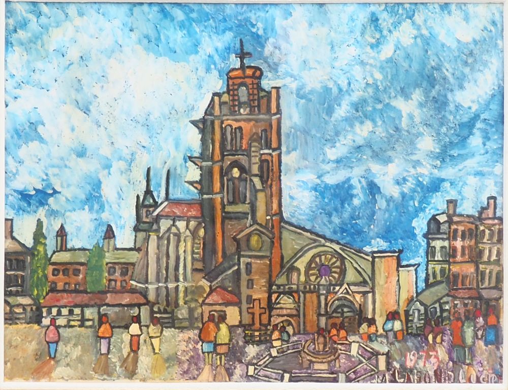 Lucie LAFOND. "La Cathédrale place Saint Etienne à Toulouse". Huile sur carton, signée en bas à gauche et datée 1973. Dim. (à vue) : 21,5 x 28,5 cm.