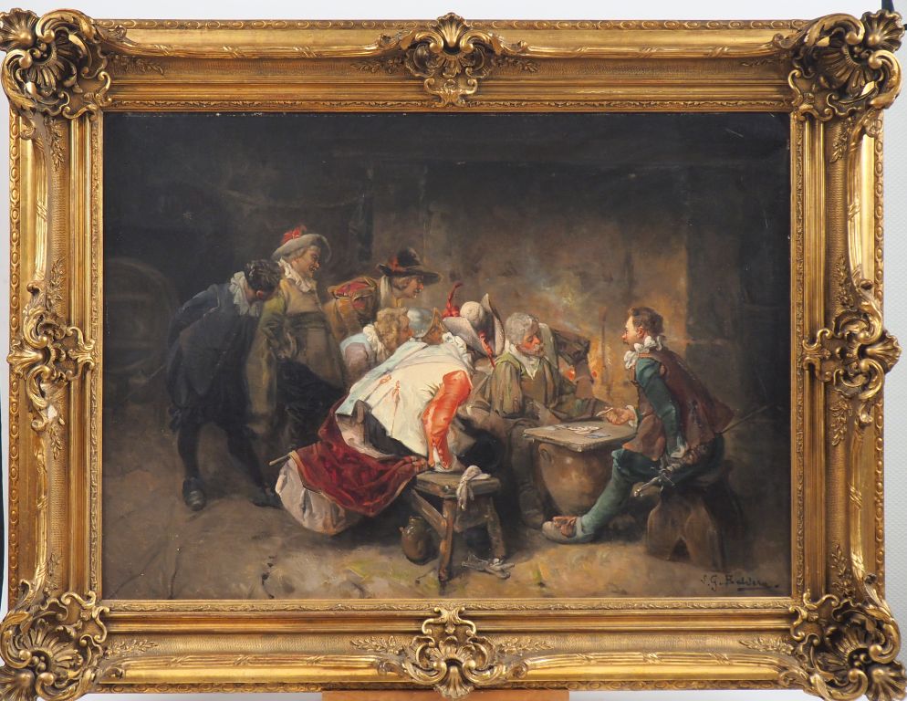 Luigi BALDERO. "La partie de cartes". Huile sur toile, signée en bas à droite. Dim. 65 x 92 cm.