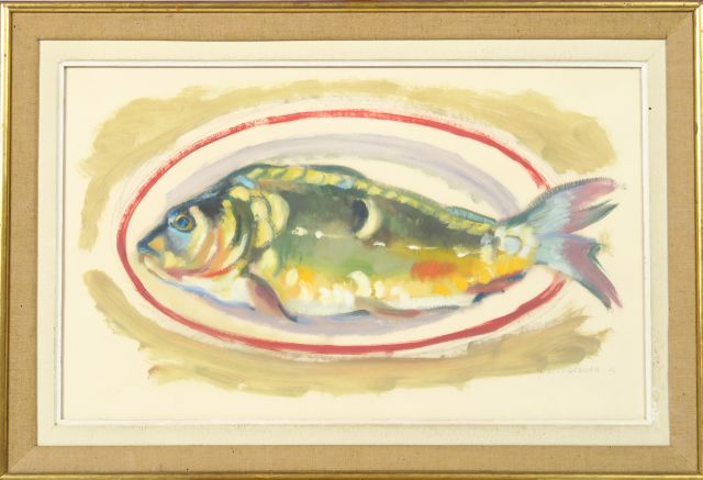 M. GOEDGEBUER "Nature morte au poisson" Huile sur papier, signée en bas à droite et datée 52 Dim. 34 x 55,5 cm