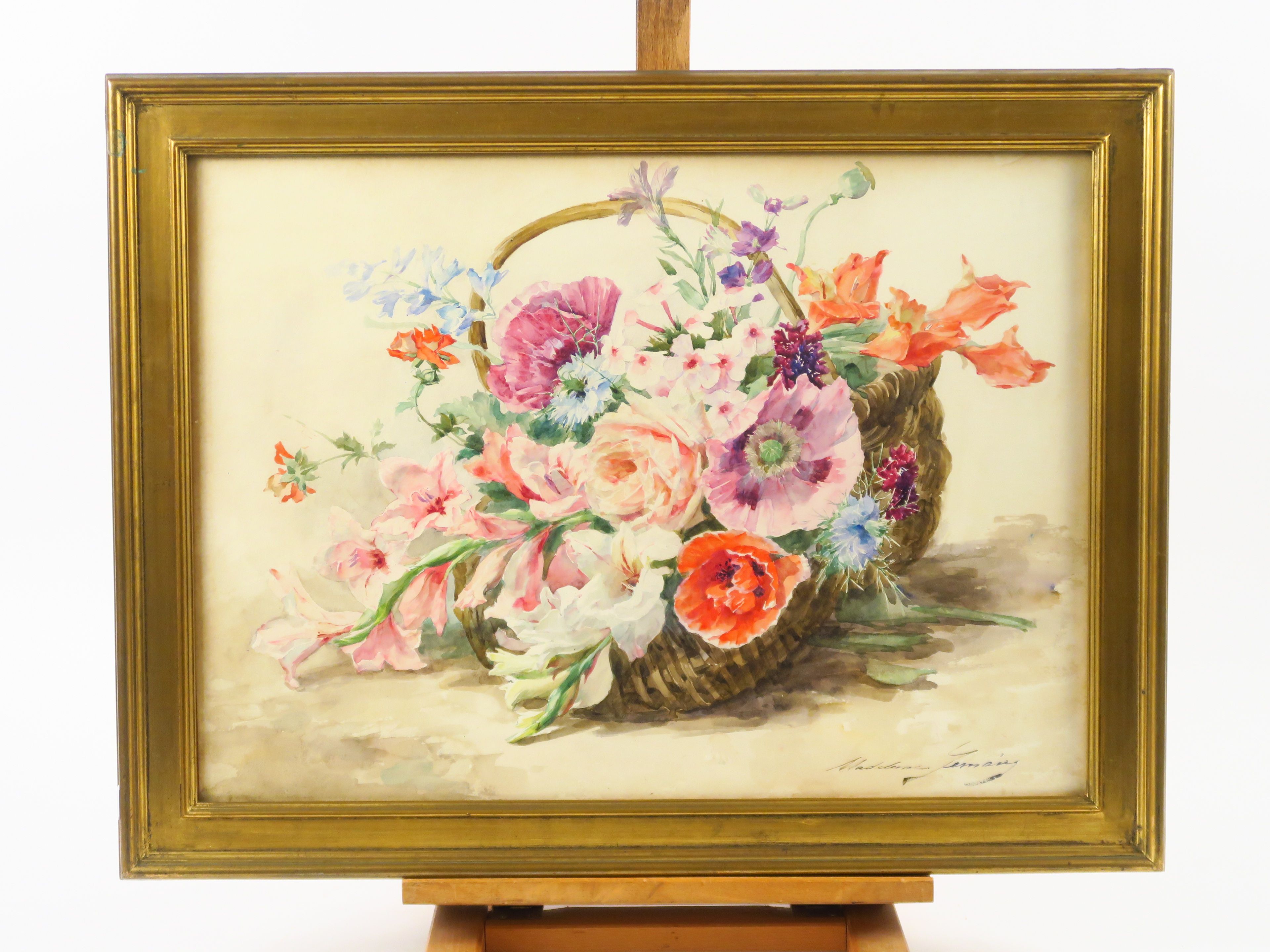 Madeleine LEMAIRE "Bouquet de fleurs dans un panier" Aquarelle. Signée en bas à droite. 40 x 55 cm