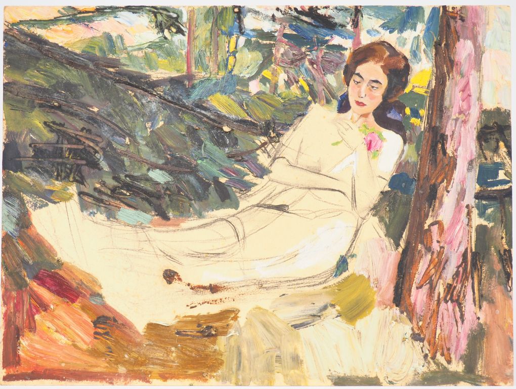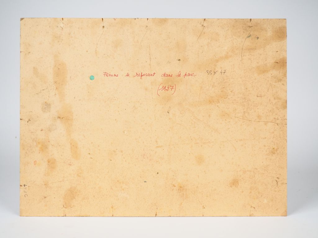 Mario CAVAGLIERI. "Femme se reposant dans le parc" Huile sur carton, titrée et datée au dos 1927 Dim. 35 x 47 cm