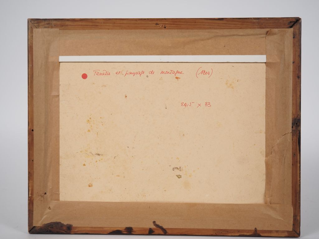 Mario CAVAGLIERI. "Fenêtre et paysage de montagne" Circa 1904 Huile sur carton Dim. 24 x 32 cm