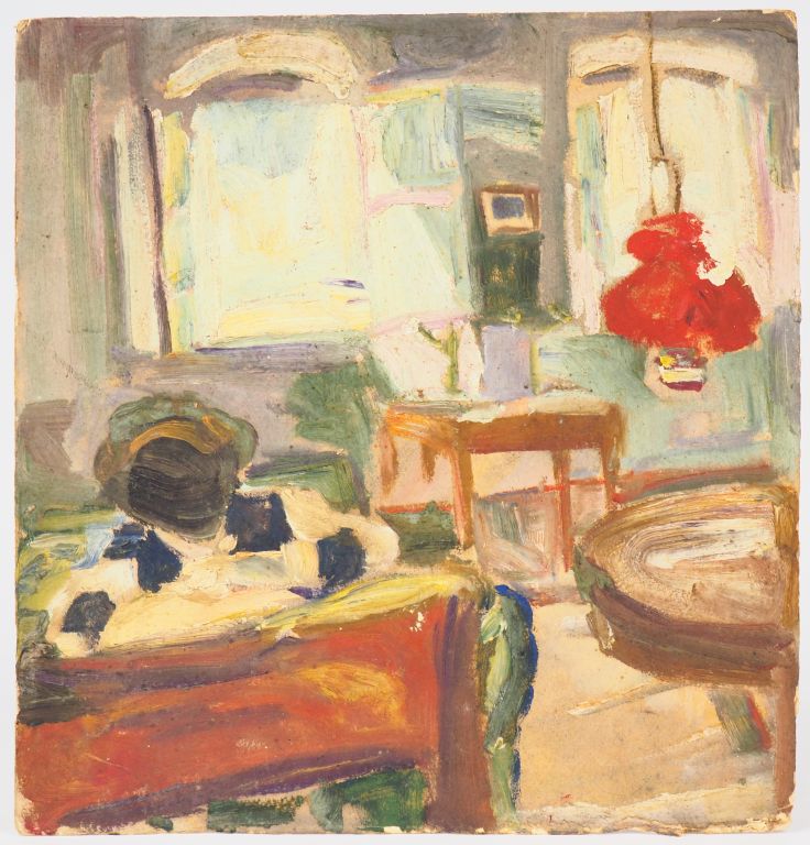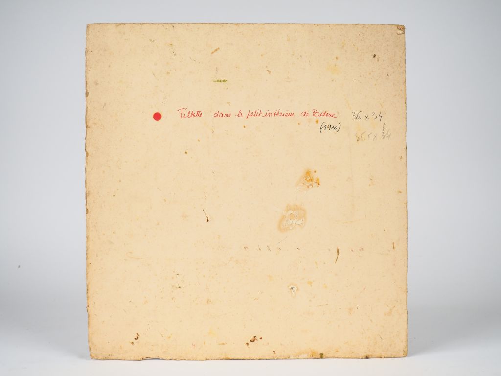 Mario CAVAGLIERI. "Fillette dans le petit intérieur de Padoue" Huile sur carton, titrée et datée au dos 1910 Dim. 35,5 x 34 cm