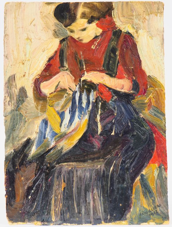 Mario CAVAGLIERI. "Giulietta coud en blouse rouge et jupe noire à bretelles" Huile sur carton, signée en bas à droite et datée 1912 Dim. 36,5 x 26,5 cm