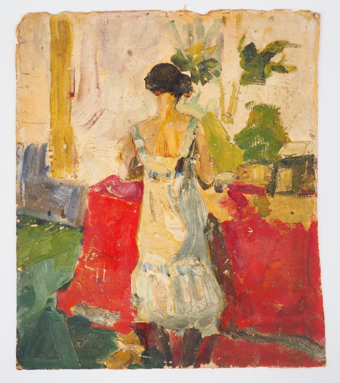 Mario CAVAGLIERI. "Giulietta de dos en jupon blanc dans l'atelier" Huile sur carton, titrée au dos et datée 1912 Dim. 45,5 x 38 cm