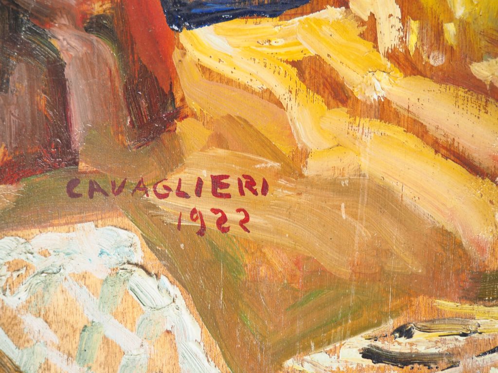 Mario CAVAGLIERI. "Giulietta devant la chapelle" Huile sur carton, signée en bas à gauche et datée 1922 Dim. 47 x 36 cm