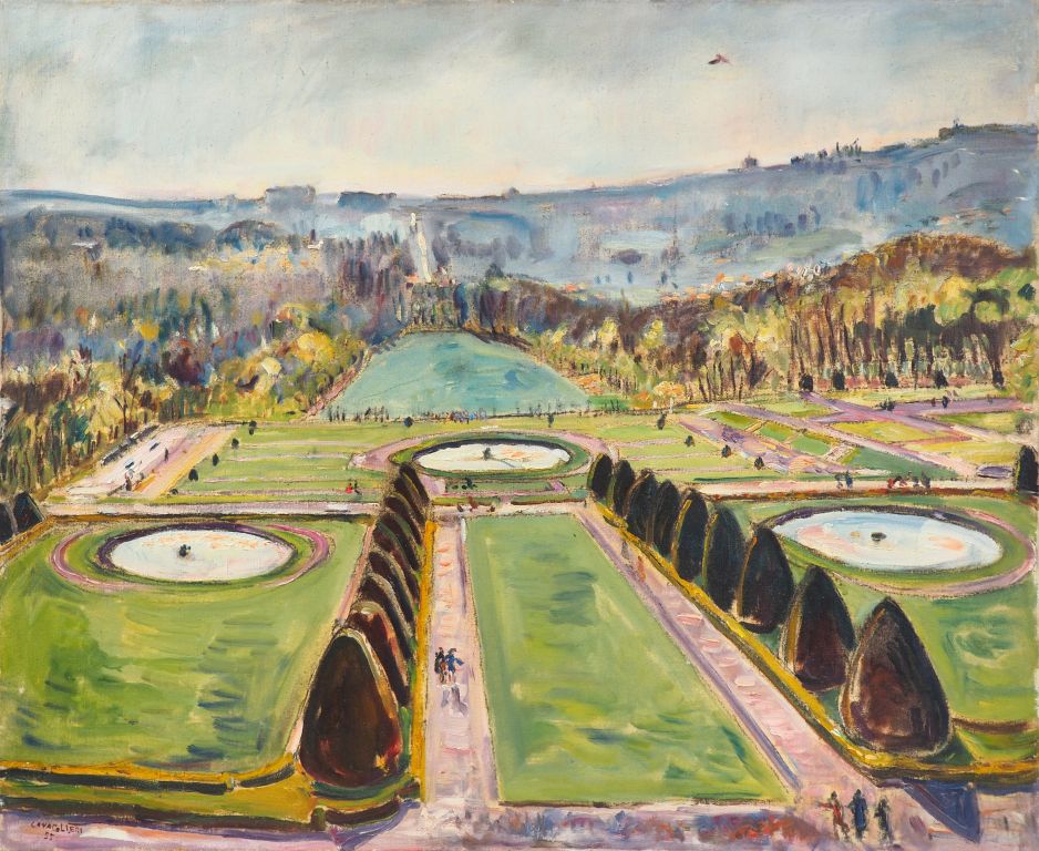 Mario CAVAGLIERI. "Hommage à Lenôtre, vue d'une fenêtre du château" Huile sur toile, signée en bas à gauche et datée 55 Dim. 60 x 73 cm