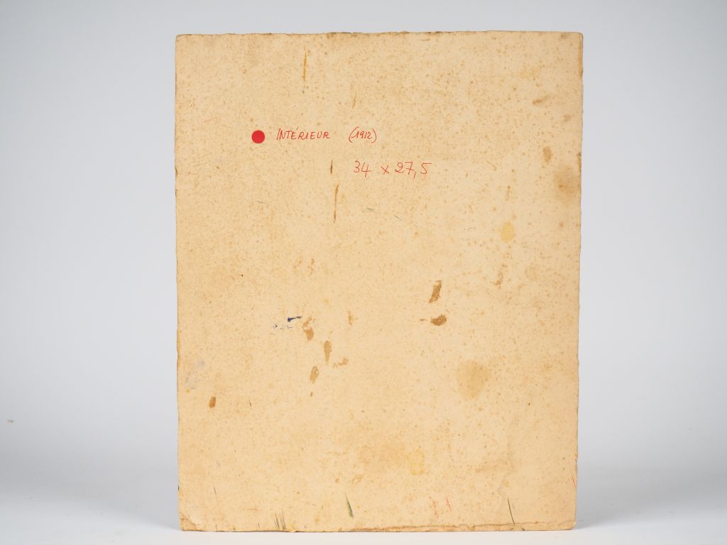 Mario CAVAGLIERI. "Intérieur" Huile sur carton, signée en bas à droite, titrée et datée au dos 1912 Dim. 34 x 27,5 cm