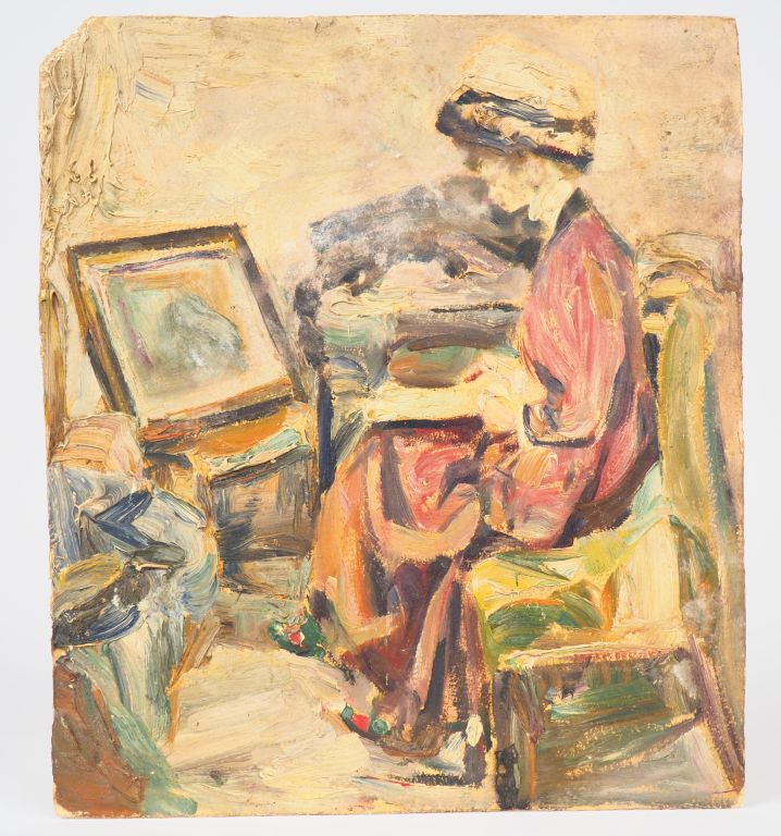 Mario CAVAGLIERI. "Jeune femme lisant" (Térésina) Huile sur carton, titrée et datée au dos 1910 Dim. 412 x 36 cm (angle droit manquant)
