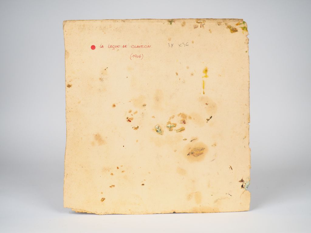 Mario CAVAGLIERI. "La leçon de clavecin" Huile sur carton, titrée et datée au dos 1906 Dim. 38 x 35,5 cm (manques)