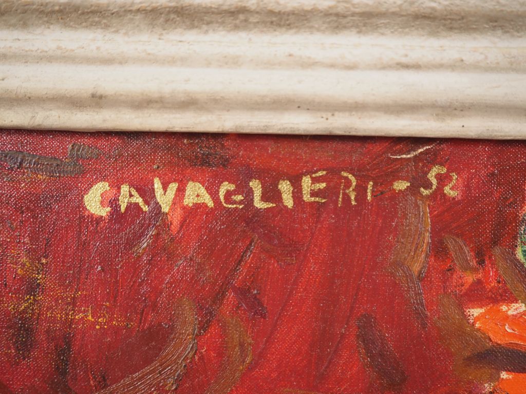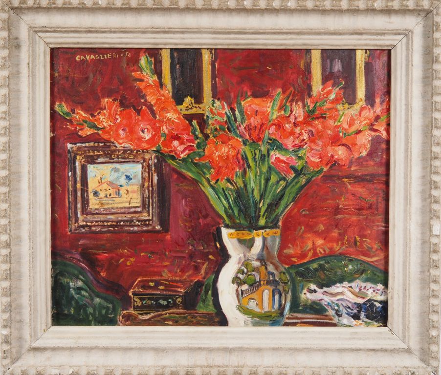 Mario CAVAGLIERI. "nature morte au bouquet de glaieuls" Huile sur toile, signée en haut à gauche et datée 52 Dim. 54 x 65 cm