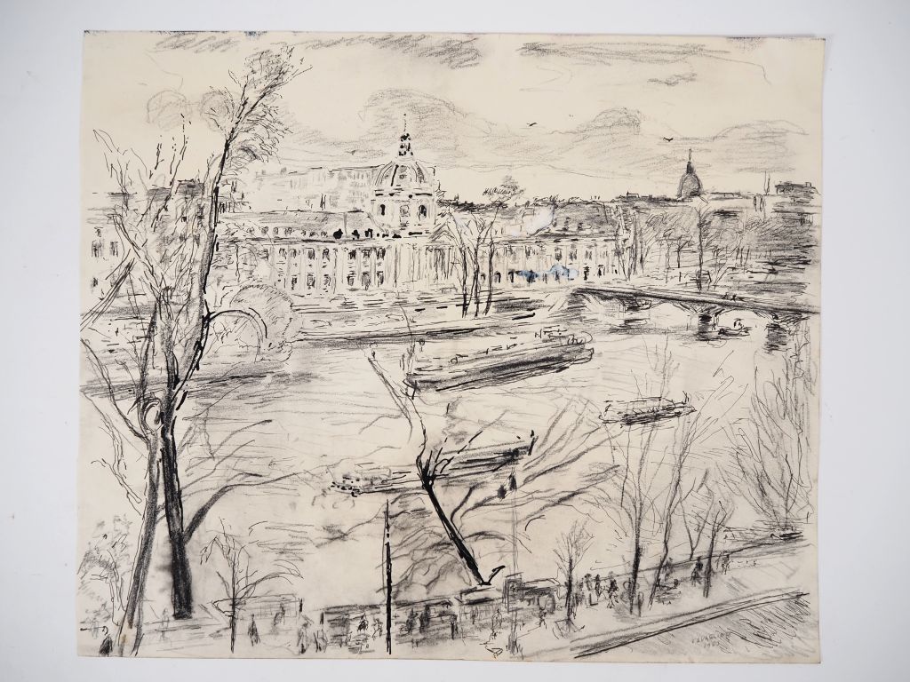 Mario CAVAGLIERI. "Paris, l'Institut" Dessin, encre et fusain, signé en bas à droite et daté 1963 Dim. 37,5 x 45 cm
